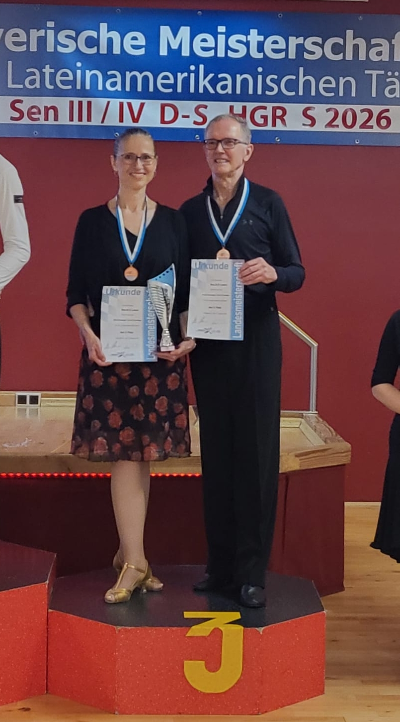 In der Senioren III D Klasse gingen Arnulf und Silvie Schweiger in einem Startfeld von 8 Paaren an den Start. Ohne Probleme ging es für die beiden durch die Vorrunde. Im anschließenden Finale drehten sie nochmal auf und konnten sich am Ende mit dem 3. Platz über einen Platz auf dem Treppchen freuen. Und nicht nur das. Mit diesem Ergebnis stiegen sie in die Senioren III C Klasse auf und dürfen ab jetztbei Turnieren alle fünf Tänze zeigen. Herzlichen Glückwunsch zu dem Erfolg!